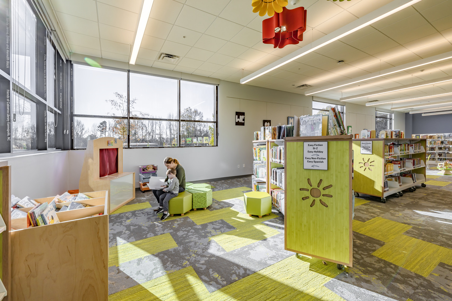 Gentle colors define the children’s space at the Cabarrus County Library & Active Living Center, fostering tranquility for easy reading. Biophilic views of nature, and organic textures further lessen anxiety for cognitive well-being.