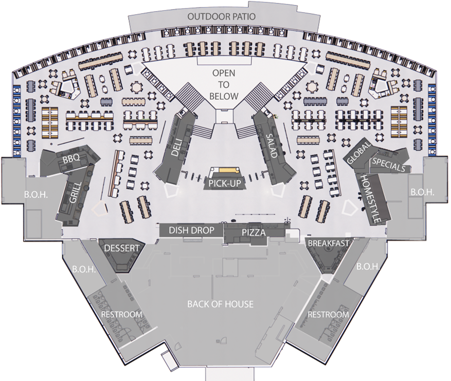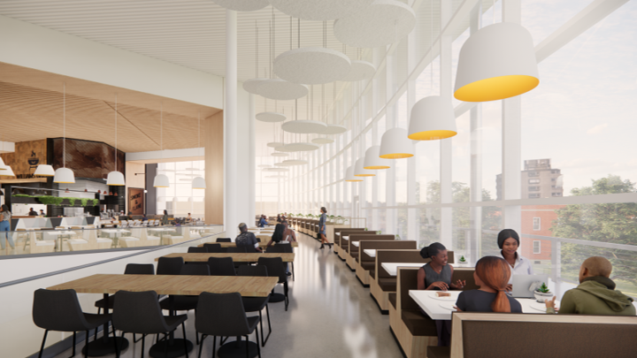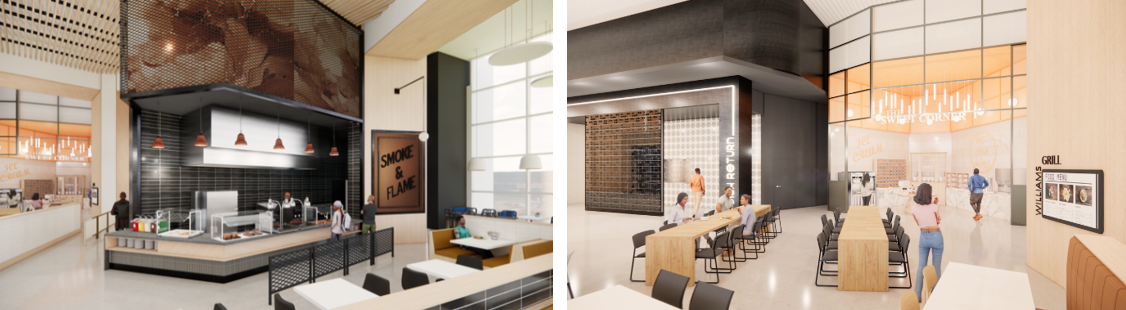 A new experience will take the place of a more central servery with seven diverse stations—ranging from pizza and barbecue to deli favorites, fresh salads, global cuisine, southwest flavors and desserts. An open layout spreading into the seating areas with clear sightlines invites movement, while contemporary finishes and natural light through floor-to-ceiling windows reframe the hall as a bright environment, bringing greater energy to campus life.