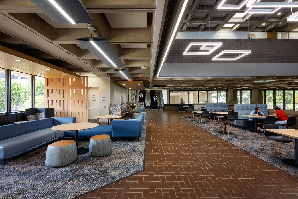 In Benedum Hall, our team embraced the below-grade location by leaning into an urban aesthetic. A new curved baffle system both conceals previously exposed utilities and maintains necessary access, while simultaneously elevating the visual experience. This element, paired with open shelving, acoustic treatments and updated furniture, transformed what had once been a utilitarian space into a more inviting environment.