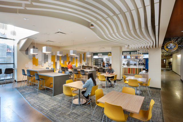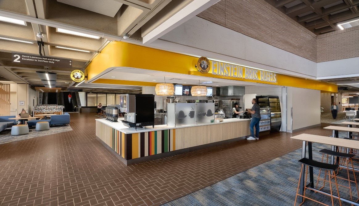 As part of a wider push to improve quality of life, the University of Pittsburgh has overhauled two existing cafés—one in Benedum Hall and the other in Posvar Hall—into social touchpoints where students can comfortably refuel and regroup. Though both cafés had long carried the Einstein Bros. Bagels name, the project weaved in the brand’s refreshed look while incorporating a palette that complements the character of the surrounding spaces.
