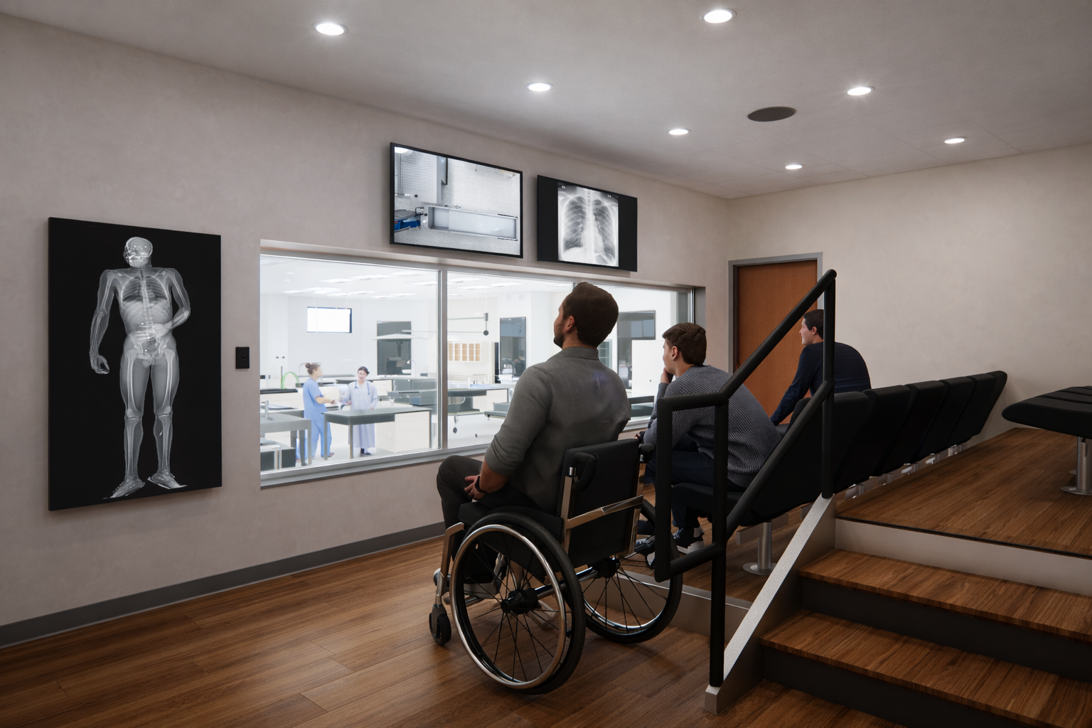 Observation rooms with tiered seating and advanced audiovisual systems allow students, residents, and law enforcement to observe procedures without disrupting autopsy operations. Remote displays provide close‑up views of pathology work while maintaining safe separation. Dedicated viewing rooms for family or legal identification offer privacy and dignity, while faculty spaces support debriefing and reflective learning. Thoughtful lighting, controlled acoustics, and strategic daylighting balance the technical and emotional demands of this field.