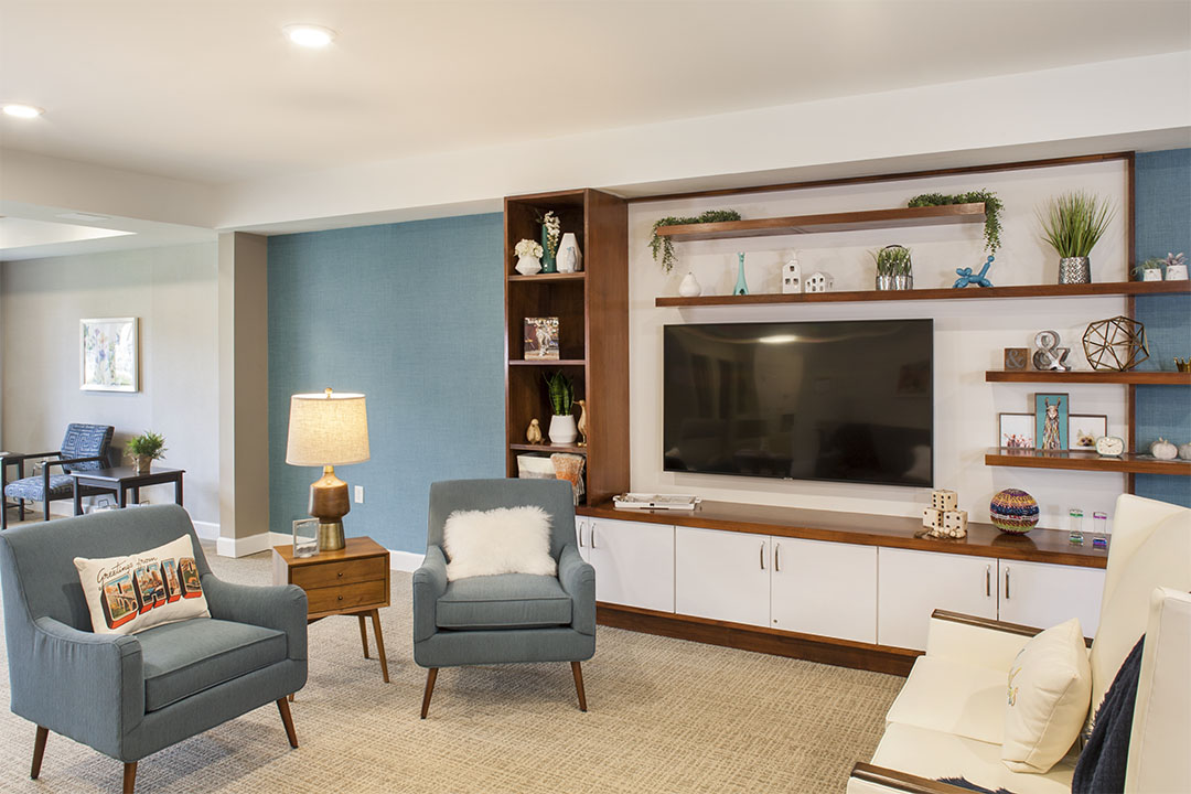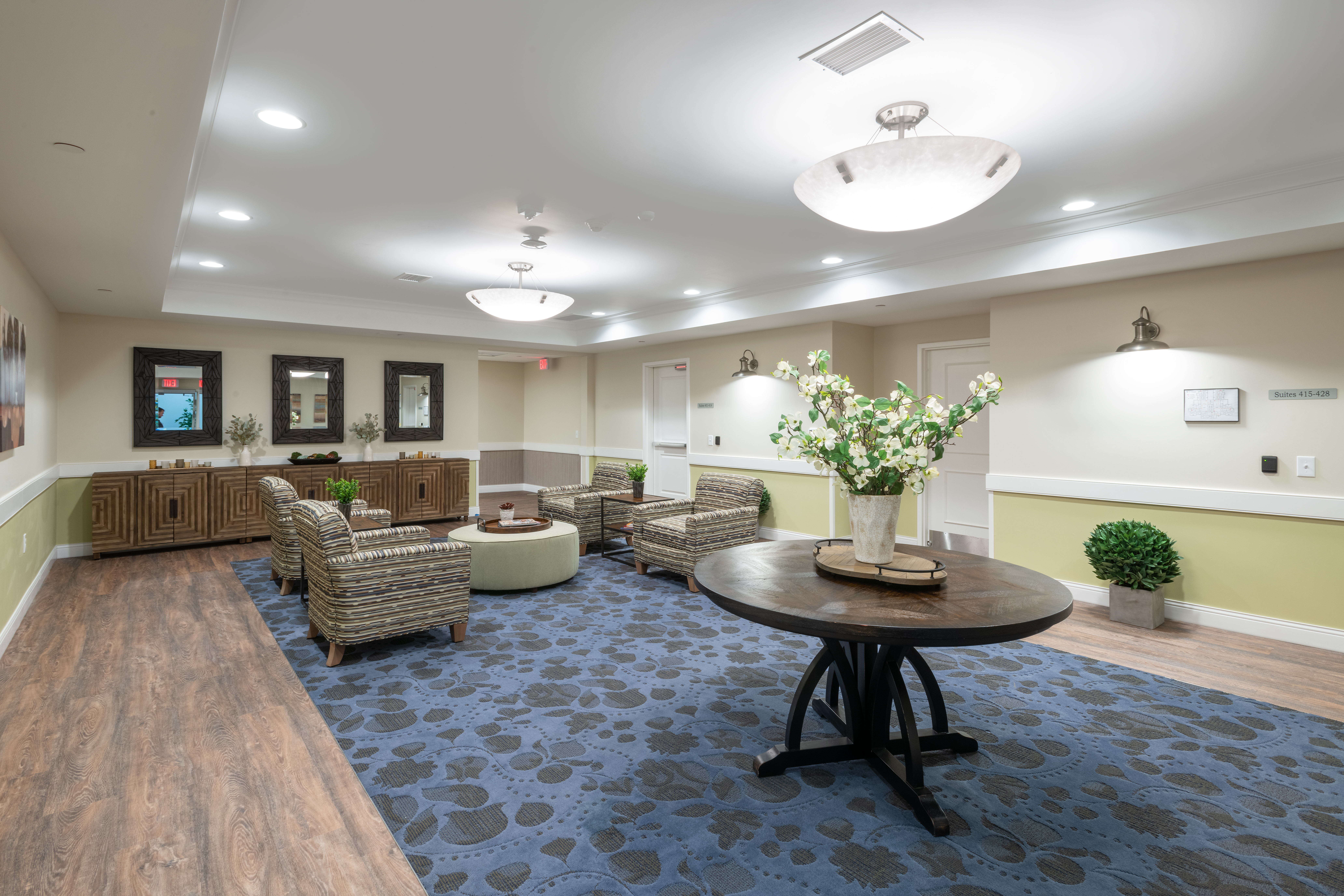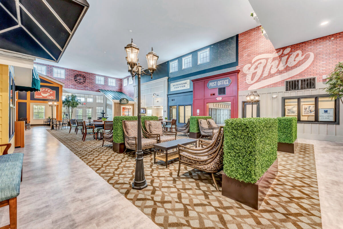Glare-controlled lighting, consistent acoustic treatments and legible wayfinding reduce fall risk, lower resident agitation and decrease staff interruptions—particularly during peak circulation hours. Together, these elements can prevent disorientation events, cut “escort” time and support calmer, more confident movement throughout the community—freeing staff to focus on proactive care.