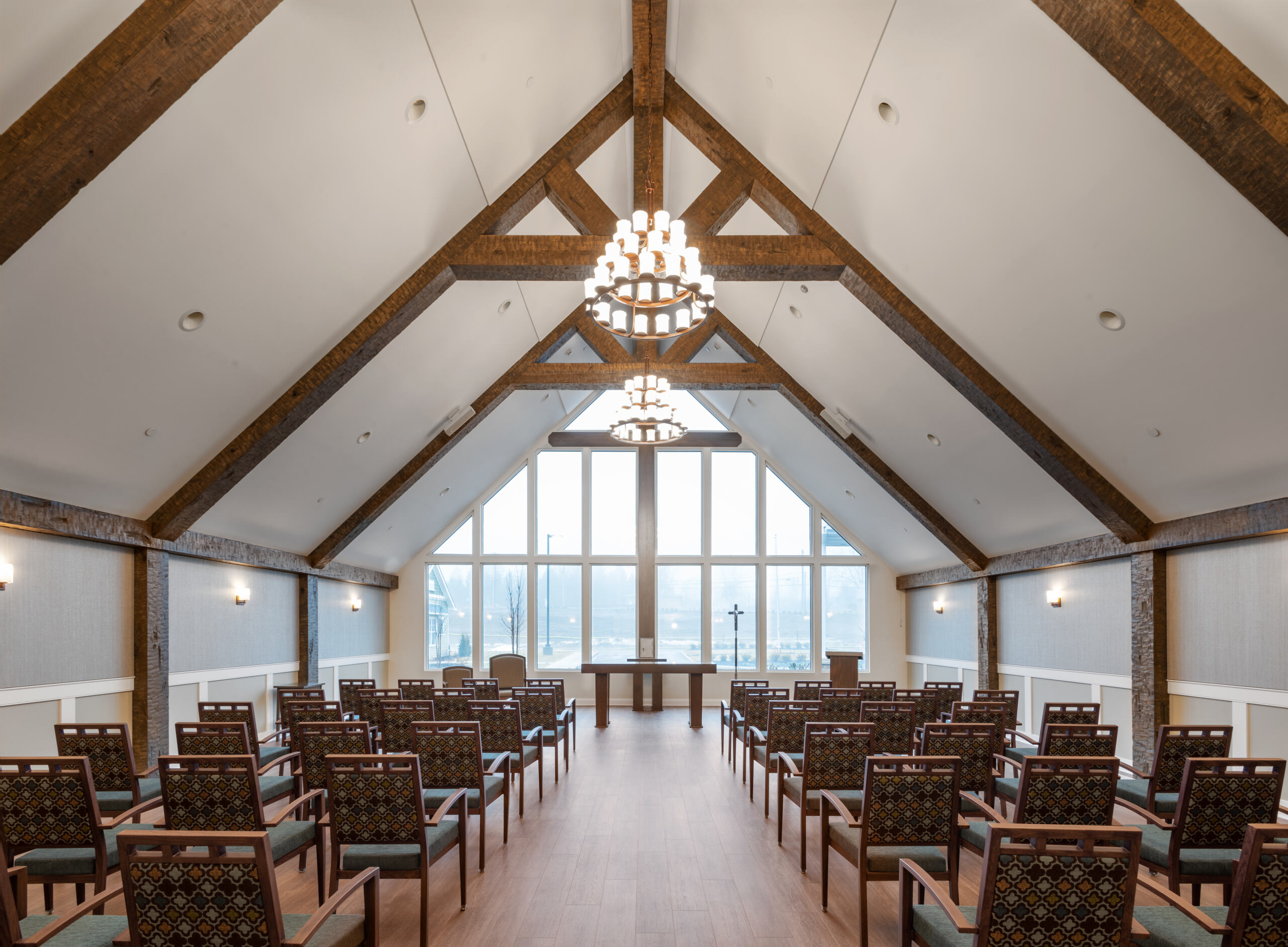Memory‑care “neighborhoods” designed with a mid‑century look and feel and abundant daylight at The Grove at Oakleaf Village in Columbus create residential familiarity—each neighborhood includes an open kitchen, dining table and living room to support privacy and meaningful activity. At The Village of St. Edward’s Wadsworth campus, restaurant‑style dining spaces, a fitness center, salon and outdoor areas are integrated alongside spiritual programming in a dedicated chapel, aligning design quality with identity.