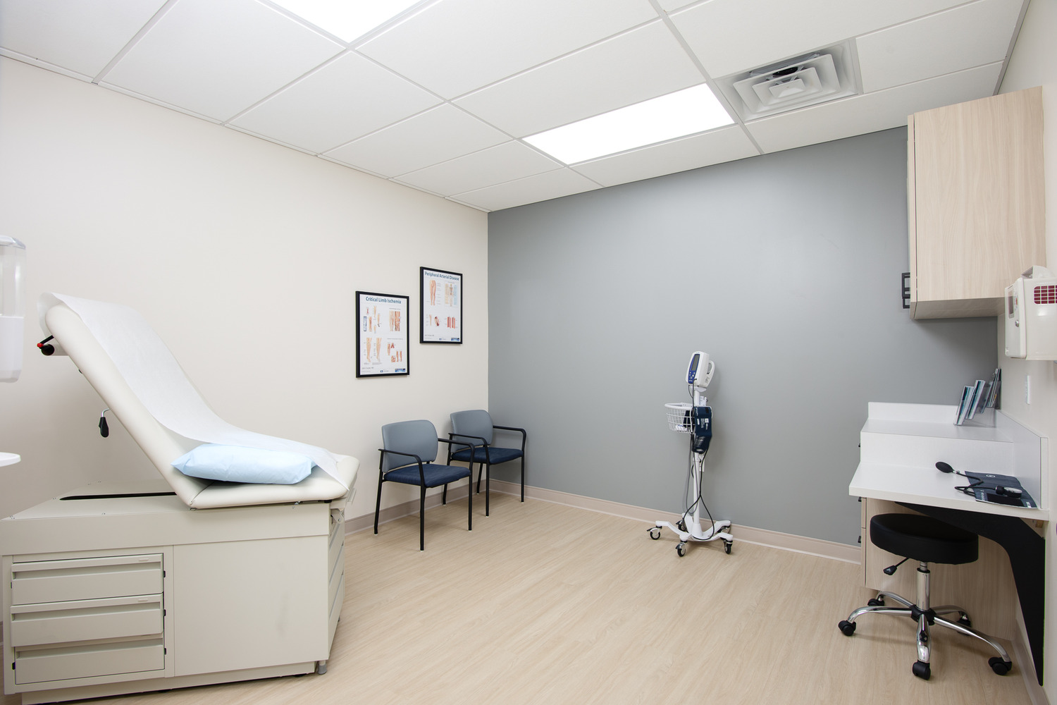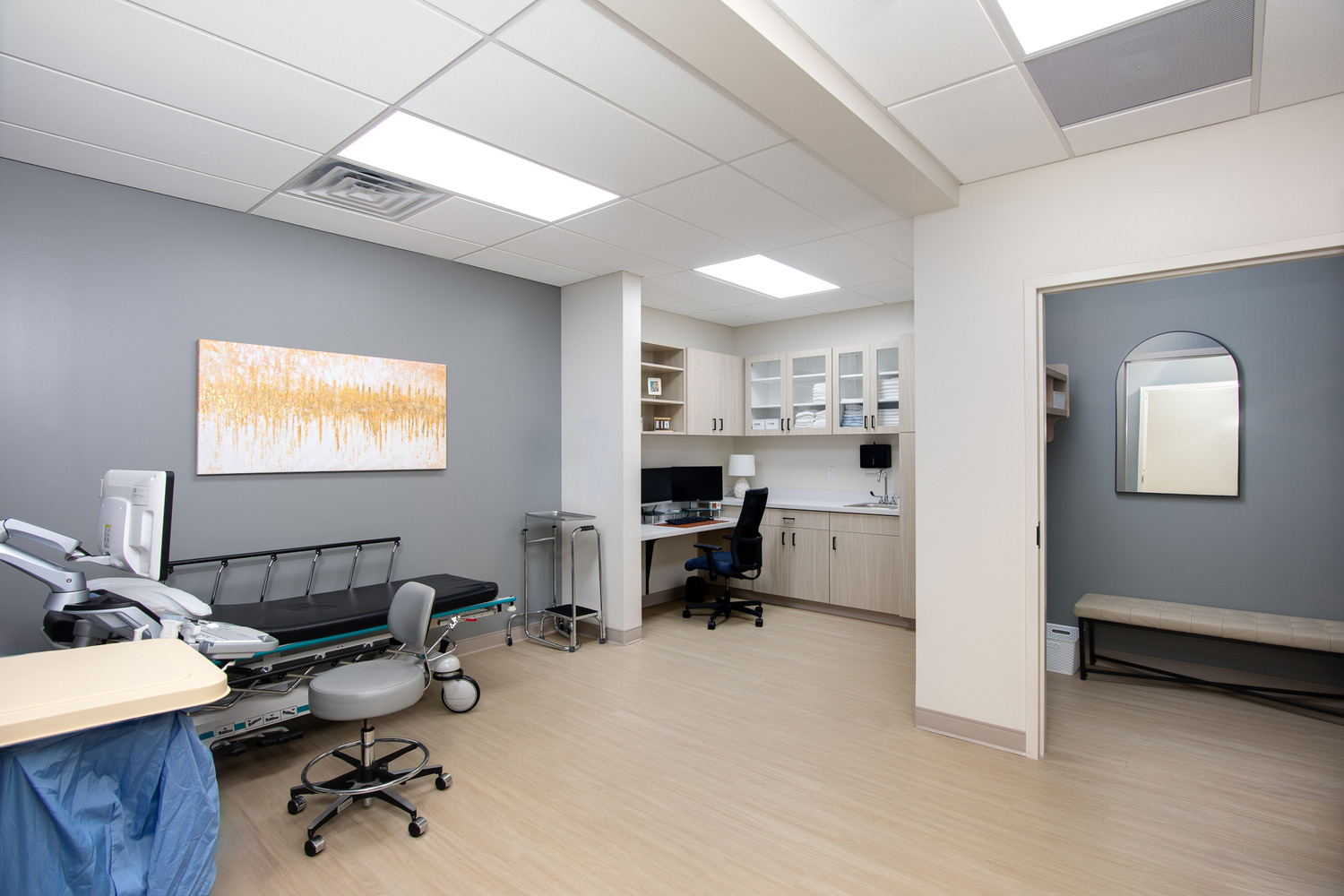 The program was carefully designed to support the practice’s clinical needs, incorporating two procedure rooms, six pre/post-op bays, seven exam rooms, an ultrasound suite, and dedicated staff areas, along with a welcoming reception and waiting space. The result is a highly functional environment that supports efficient workflows while enhancing comfort for patients and staff alike.