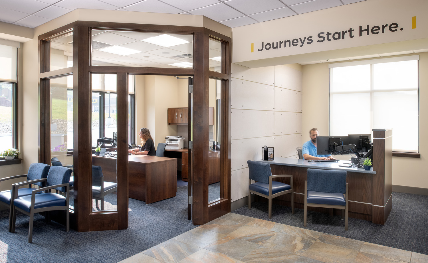 The project arrived at a pivotal moment. Coming directly on the heels of a complete rebrand, the Bradford branch became the first new facility to showcase High Point’s updated colors, logo and identity. The design challenge was twofold: to capture the energy of the refreshed look and feel in a way that felt compelling, while still preserving the familiarity members valued.