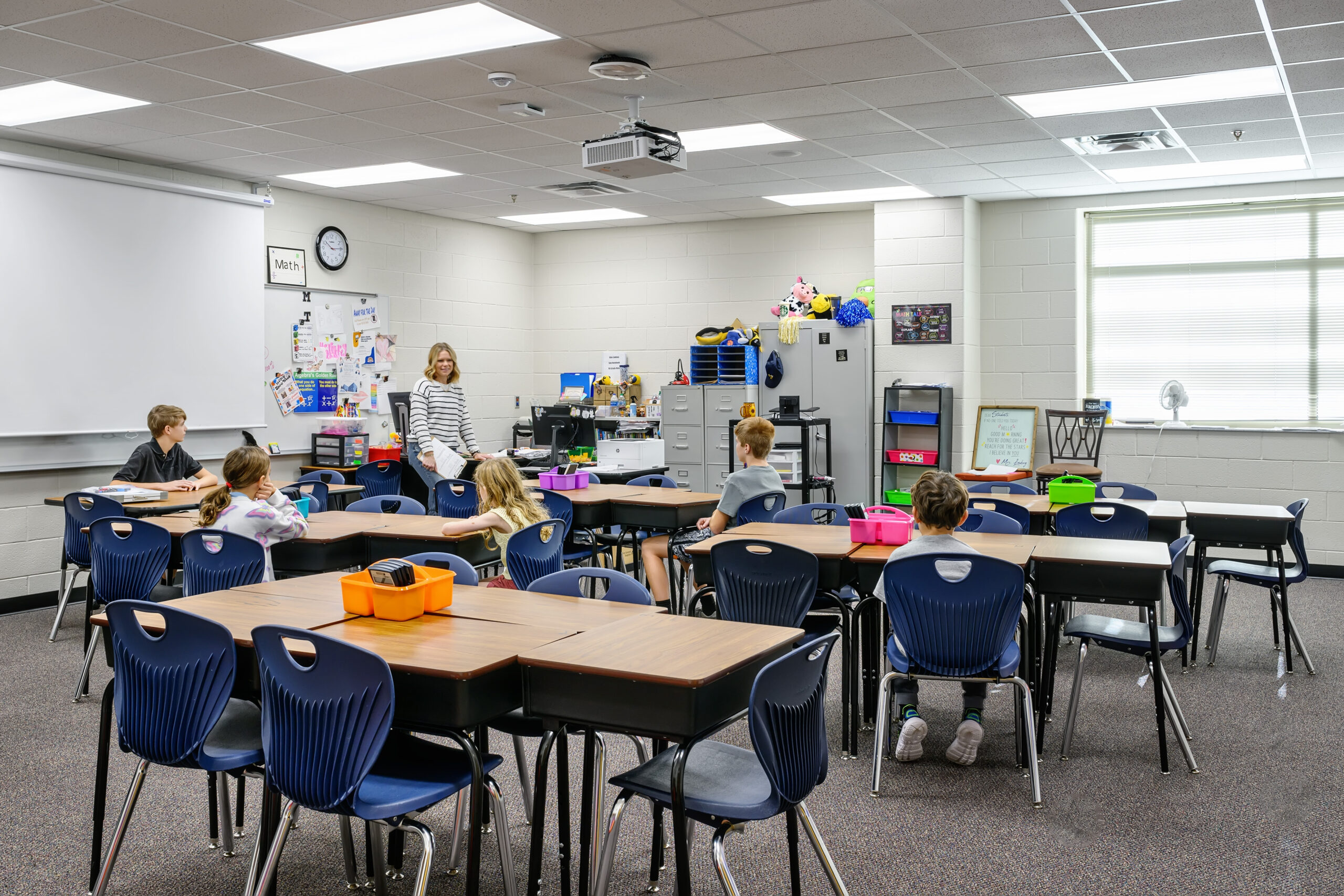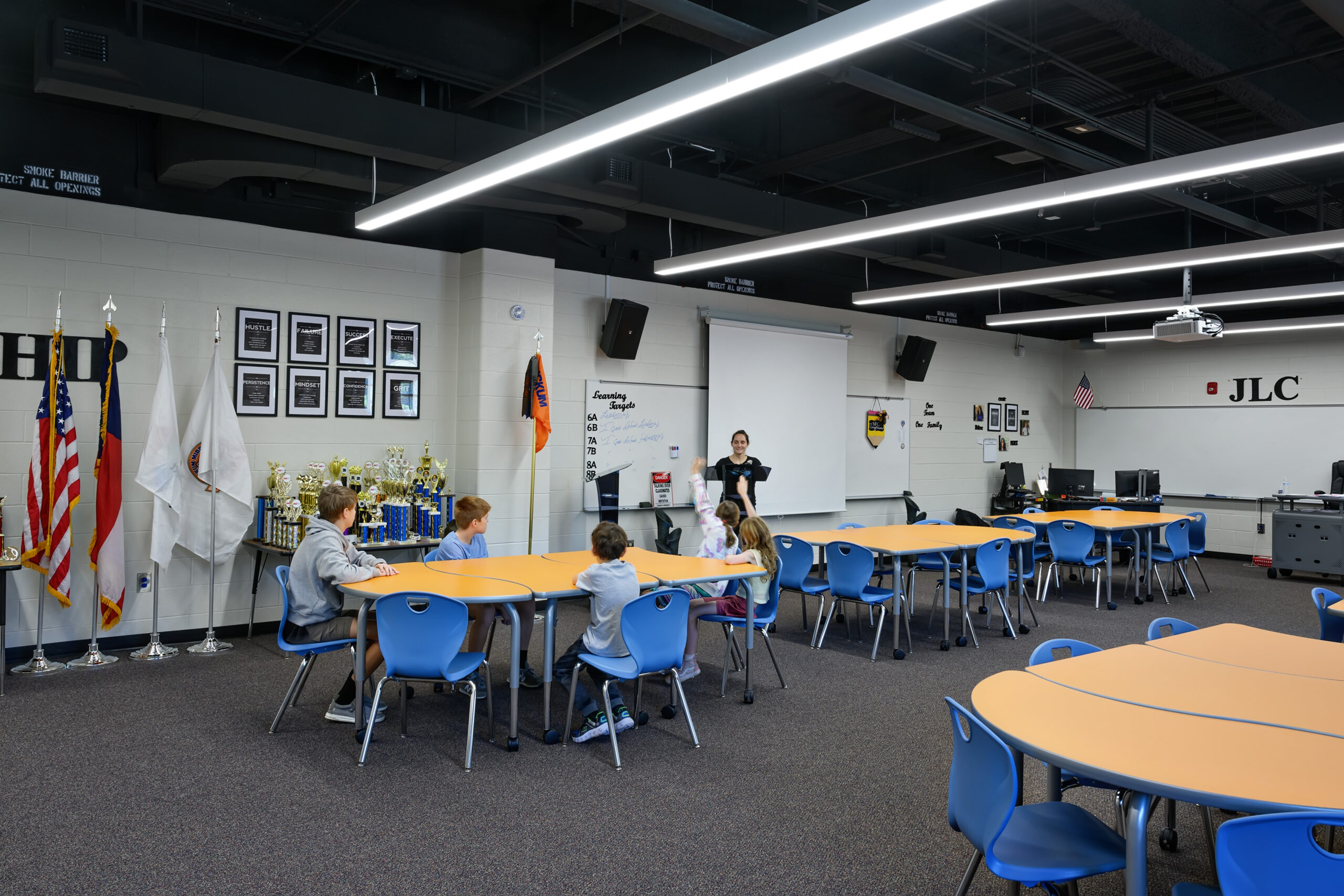 A common space in the Odyssey High School library with a few students working at tables and walking about the space, with bright lighting and navy blue accents.Odyssey High School Library and Makerspace Renovation