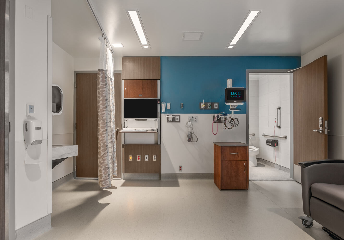 For more than a century, UNC Health Wayne has served as a cornerstone of care in Wayne County. This commitment to patient wellbeing inspired the reimagining of an outdated 60-bed medical/surgical unit into a modern Intermediate Care (“step-down”) Unit that balances clinical sophistication with a restorative, human-centered environment.