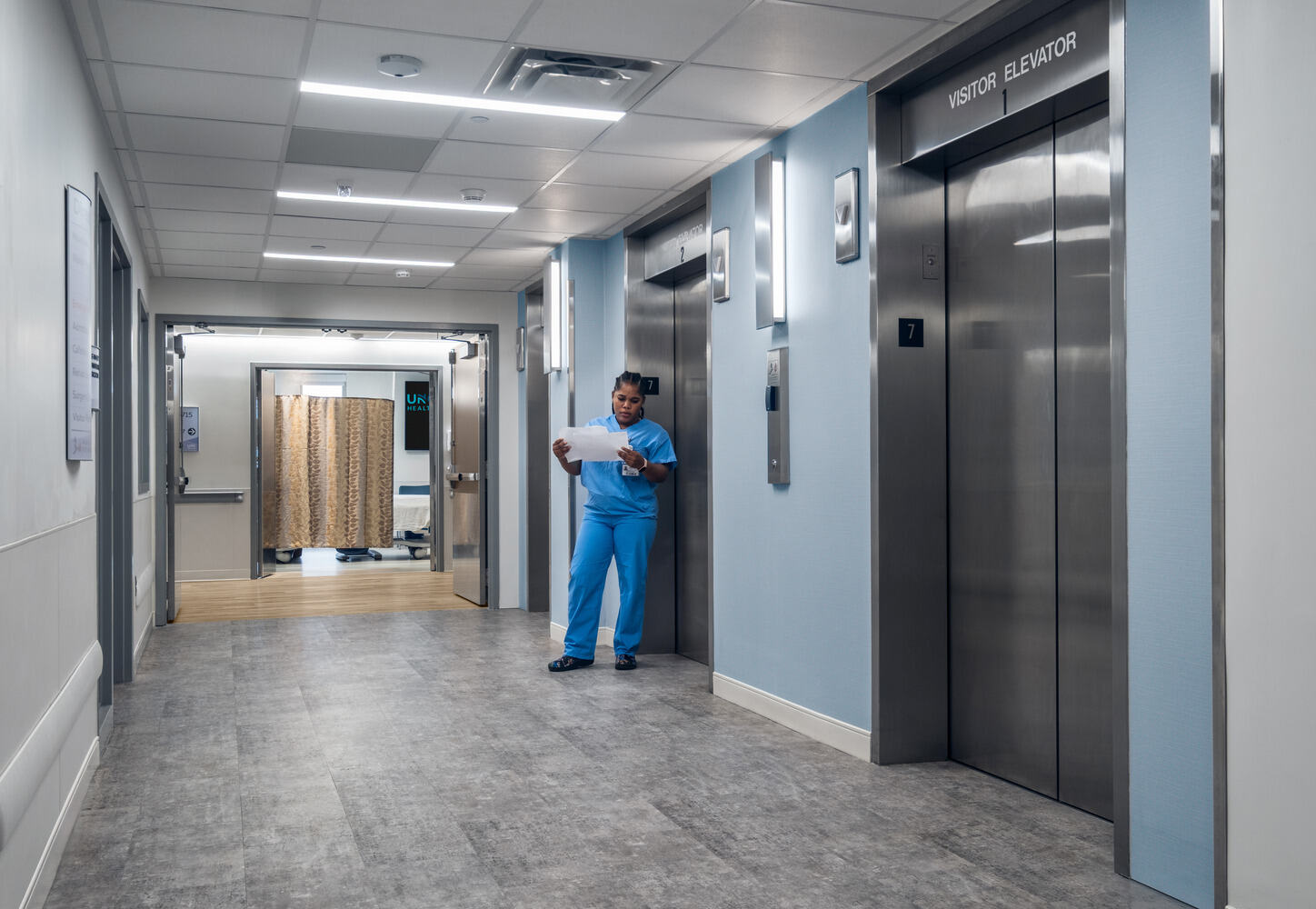 By minimizing the footprint of the central station, we were also able to create dedicated on-unit storage for equipment, streamlining workflow and reducing the risk of error. Corridor lighting was redesigned with edge-mounted linear fixtures that eliminate the strobing effect experienced by patients being transported on their backs, further improving comfort and dignity in care.