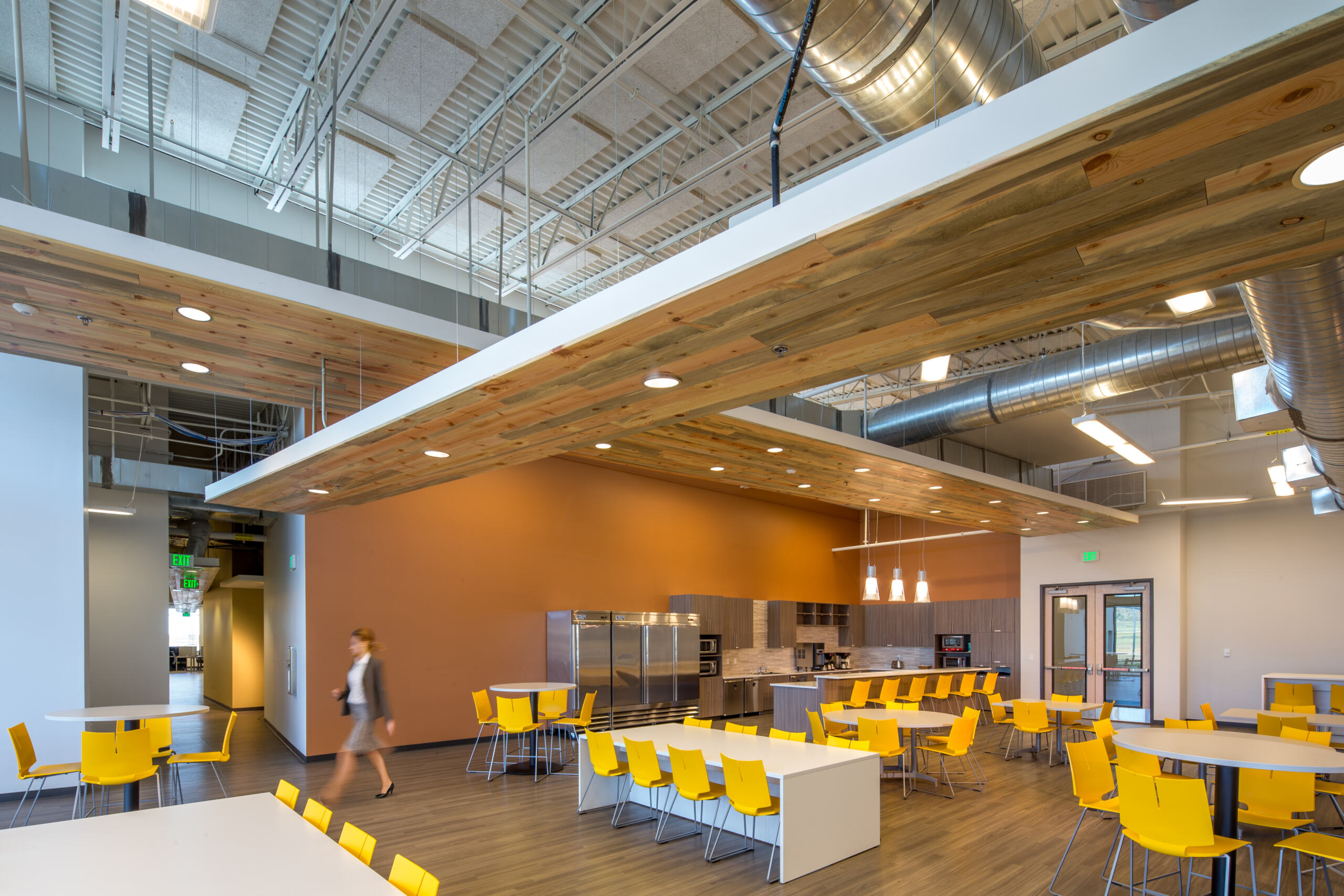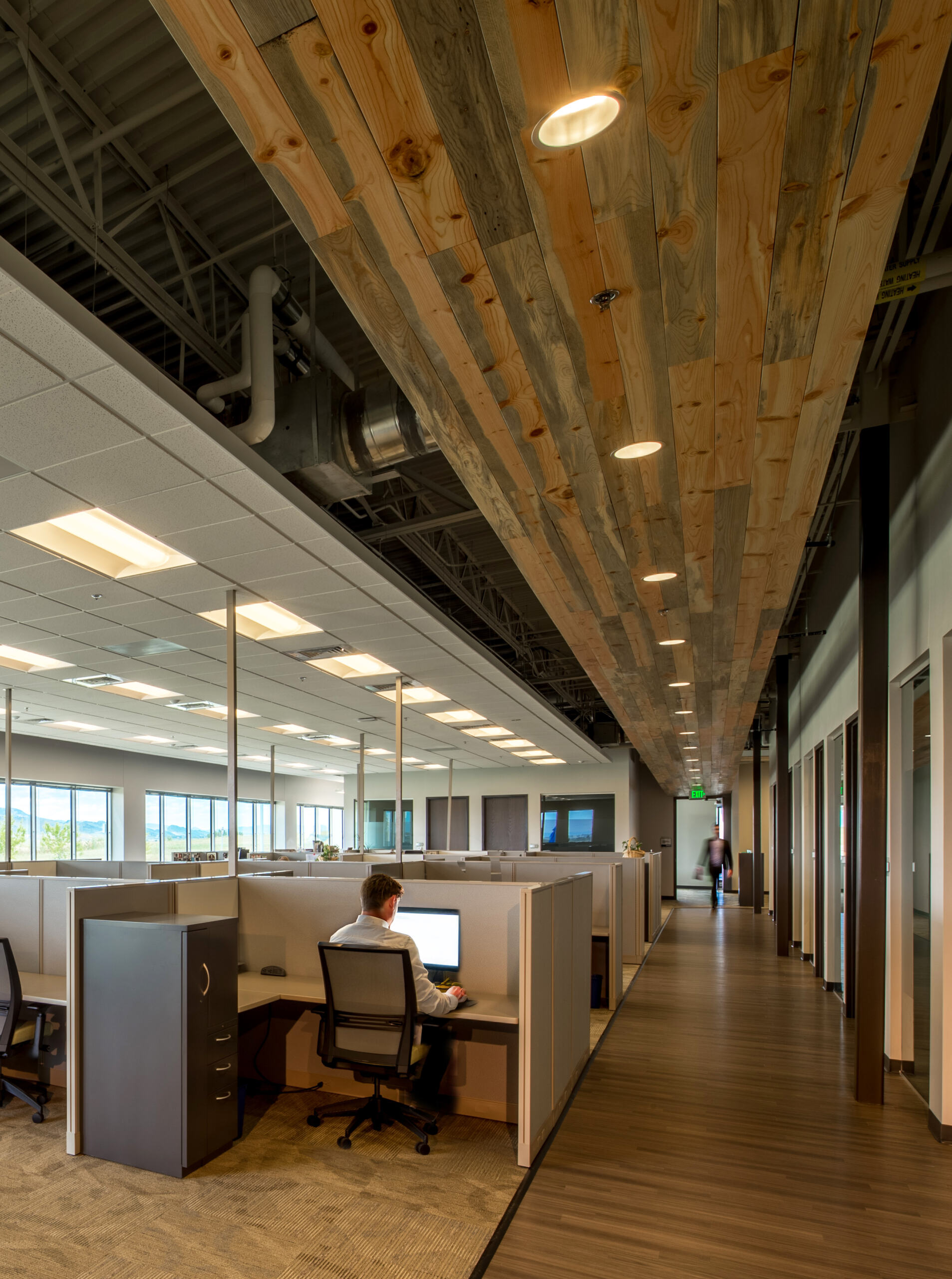 Thermomass tilt-up concrete walls are complemented by board form textures and wood accents at the entry, while expansive floor-to-ceiling glass along the east and west façades floods the interiors with daylight and frames panoramic mountain views—bringing warmth and wellness to a highly technical setting.